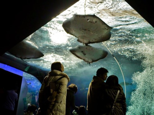 まず最初に通るのは、相模湾ゾーンです。水族館がウリにしてる相模湾大水槽が2階から見えます。1階から巨大水槽を見るために通るルートに、エイを下から見れる水槽もありました。