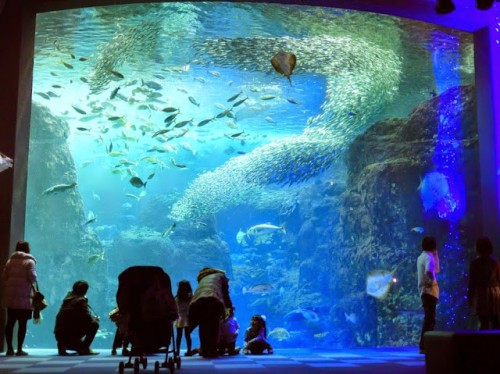 そして、これが巨大水槽。マイワシが8000匹もいるそうです。こんな見事なベイトボールを見たのは初めてかも。ここでミラクルが起こり、写真を撮ったらイワシの大群がジュゴンみたいな形になってくれました。