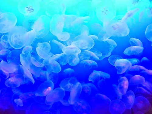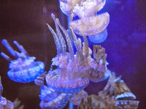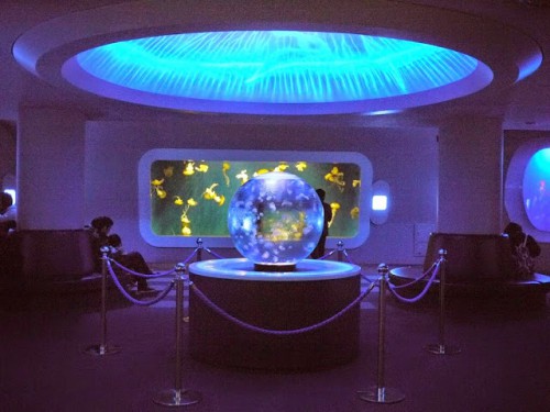 次はクラゲファンタジーホールです。ここの水族館はクラゲにも力を入れてます。月9ドラマ「流れ星」でも、上戸彩さんがクラゲを見に来るシーンが何回もありました(嫁はこのドラマが大好きでした)。ホールの入口には球型水槽「クラゲプラネット(海月の惑星)」がありました。