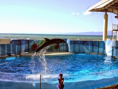イルカショーはよく見るイルカのトレーナーさんがイルカに指示を出して芸をさせる感じではなく、お姉さん達が歌って踊りながらイルカもパフォーマンスするといったショーでした。お姉さんはイルカのトレーナーにしては歌が上手いから、もしかしたらミュージカルとかの女優さんが泳ぎやイルカに指示を出す練習したのかもしれません。