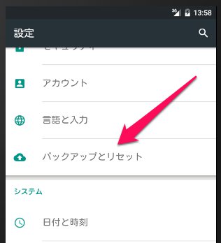 設定一覧画面に戻って「バックアップとリセット」をタップ。「端末が壊れても、すぐに復活できるようにバックアップは大切なんだよ」と伝えましょう。