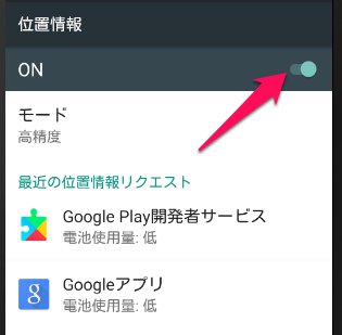 Google設定の設定一覧画面に戻って、「位置情報」をタップします。そして、位置情報をオンにします。