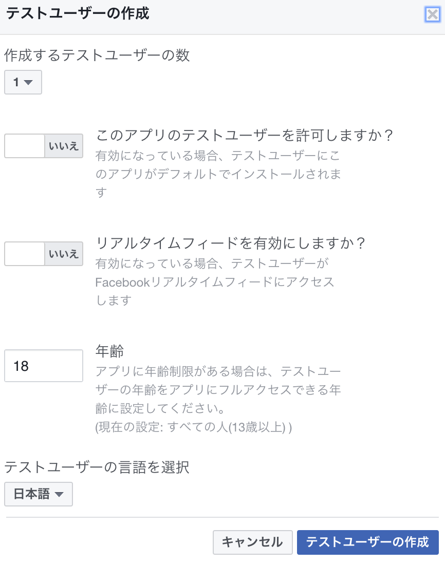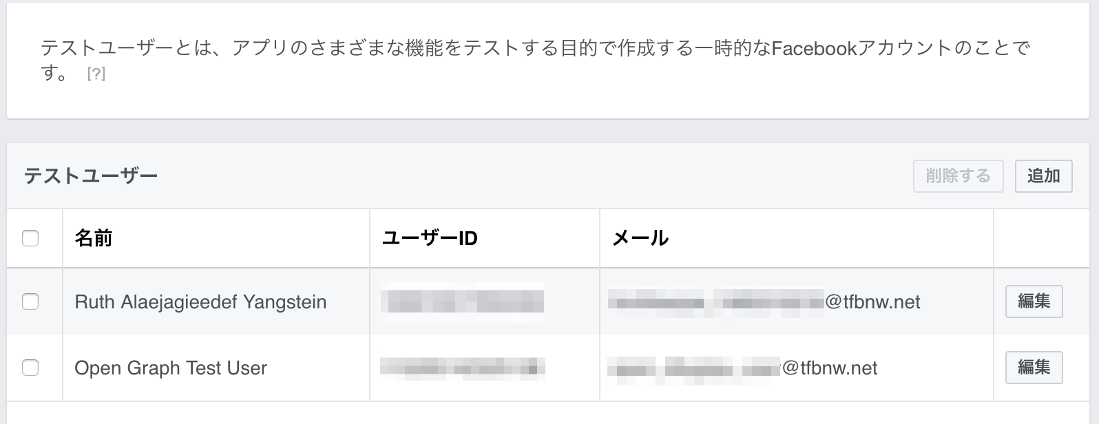 余談。アプリ用にしかテストユーザーを作れないのか。と思ったけど、自分のサービスやプロダクトでFacebookテストユーザーを使いたいってことは、大抵の場合、Facebookアプリを作っているはずだから、アプリに対するテストユーザーでいいのか。