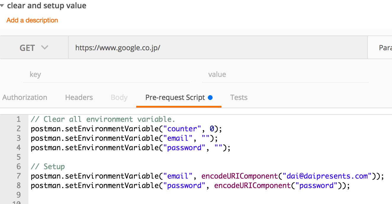 Pre-request Scriptというタブでは、実行前のスクリプトをJavascriptで書ける。