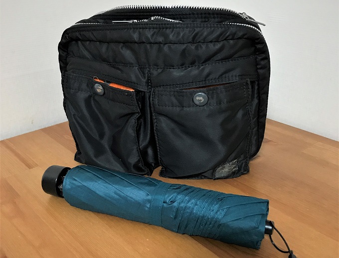 軽量性もすばらしく、わずか150gしかありません。一番最初の写真のように、折り畳み時25cm、収納時27cmなので、ポーターの小さいバッグにも入ります。長年愛用した超コンパクトなinnovatorと比べると、小ささでは負けていますが、トレッキングアンブレラのほうが畳みやすくスリムに収まります。