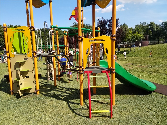 しかも、この遊具も難易度が高いものが多いです。上の遊具はよじ登ったりしながら進んでいくものですが、いきなりねじり上がった雲梯が出現しています。大きい子ども以外は為す術もなく落ちていきます。