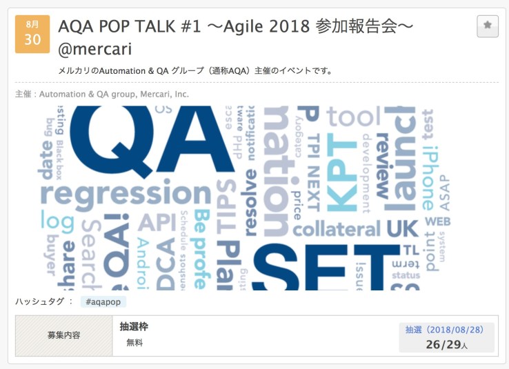 夏の終わり 8/30(木)に AQA POP TALK #1 〜Agile 2018 参加報告会〜 を開催します。久しぶりの勉強会開催 & 発表です。ドキドキが止まらない、ような気もしないでもない。