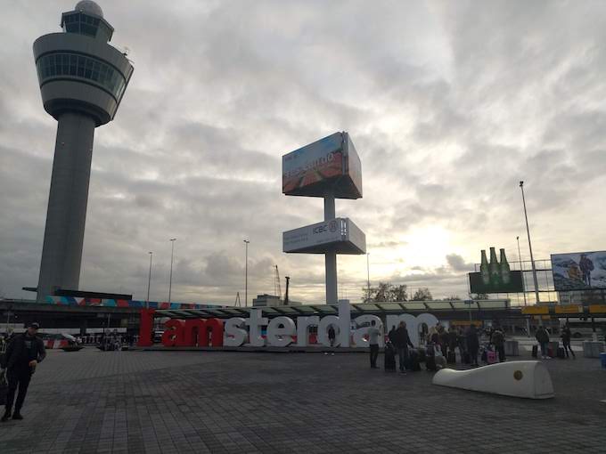 日本からオランダ アムステルダム スキポール空港までは、直通便で12時間のフライト。そんなに時間があったら機内映画全部見ちゃえそうと思うぐらい長。着いた時間は夕方16時ごろ。でも、もうこんなに暗いです。