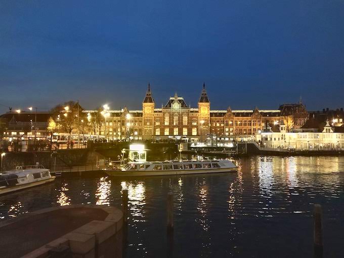 アムステルダム中央駅は、ライトアップされてとてもきれいです。運河の街自体が世界遺産に認定されており、石と水の街はとても幻想的。