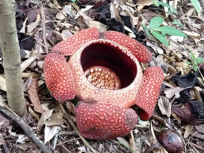 ラフレシアはとても弱い花だそうで、人間が少し触るだけでも影響が出るそうです。花の近くにころがっている茶色い大きい種みたいなのがラフレシアの蕾。蕾があるからといって、作とは限らないそうで、ここの管理者が虫や鳥や獣から守っているそうです。