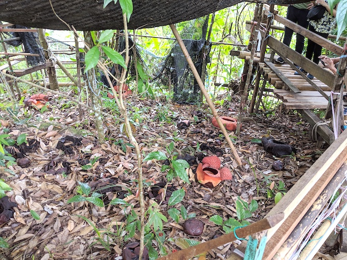 ポーリン温泉から車で5分ほど進んだ場所に、Tambunan Rafflesia Reserveというラフレシアの観光スポットがあります。30RM(リンギット)必要ですが、ラッキーなことに4つ咲いていたので、ラフレシアの群生を撮影できました。