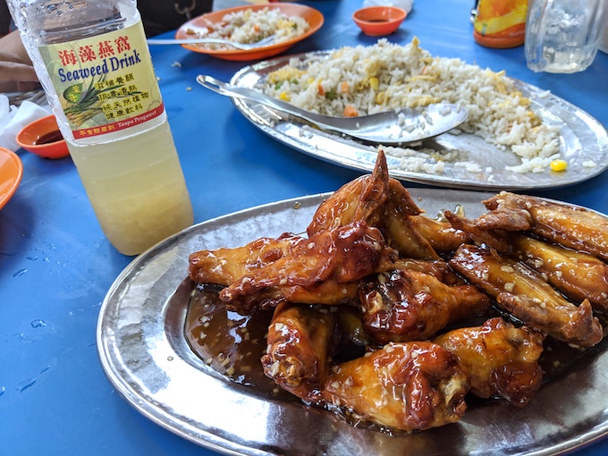 夜ご飯はFatty Keeでオイスターソース味の手羽先をいただきました。マレーシアは中華寄りの味付けが多く、皿のサイズを選べる店が多いですが、料理をSで人数分頼んで、フライドライスを2皿(3〜4人前)頼むといい感じ。