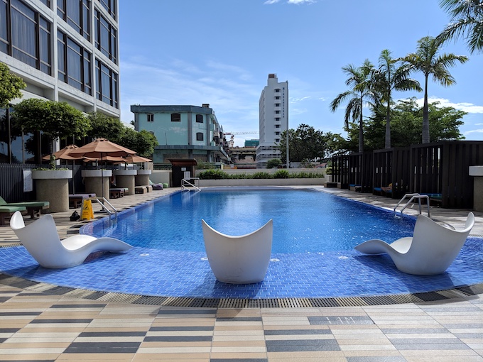 ホテルのプールはこれぐらいの大きさ。水はちょっぴり冷たく、外気が暑いのでちょうどいい感じです。ただ、11月だと夜は少し寒く感じました。奥に子供用プールがあるので、静かに過ごしたいなら手前側を選んで座ると良いです。