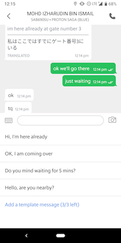 配車はUberと同じく簡単。おそらく、タクシーより安い(もしくは同レベルの値段)のではないかという気がします。しかも、Uberとは違い、待ち合わせ場所のやりとりで運転手からチャットが届きます。英語でのやり取りだけど、自動翻訳や定型文も選べるのでとても便利です。