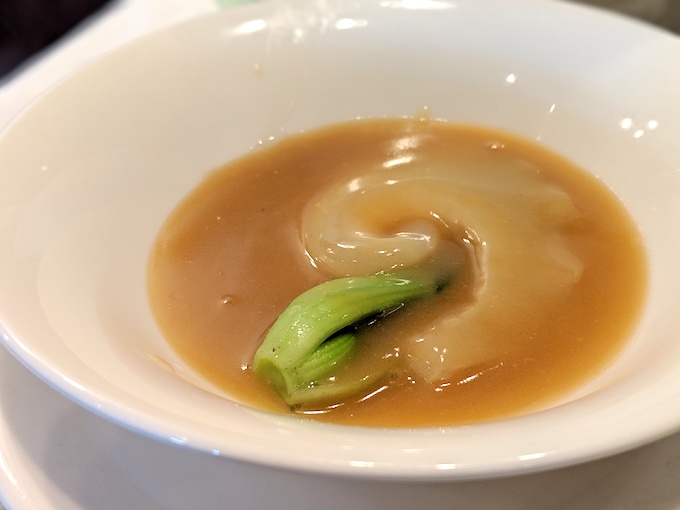 招福門はふかひれ専門店でもあるので、フカヒレスープが絶品です。スープは他のお店と違いとろみの強いこってりスープ。安直で申し訳ないですが、横浜家系ラーメンのようだなと感じました。