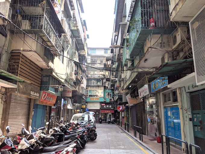 香港には新しい風景と古い風景がまじりあった場所がある。平地が狭いせいか、高階層ばかりの古いマンションの奥には、さらに公開層のビルが影のように伸びていた。