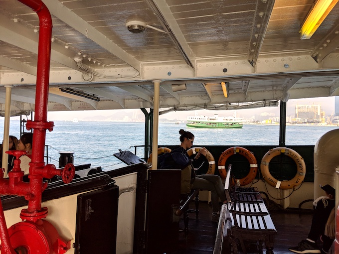 もちろん移動手段はスターフェリー。海とフェリーの燃料のまざりあった独特な船の匂いを発しながら、のんびりコトコト海の上を進んでいく。流れの早そうな海峡の絶妙な揺れによって、久しぶりに船酔いになった気がするが、海風を大きく吸うと気分が楽になった。