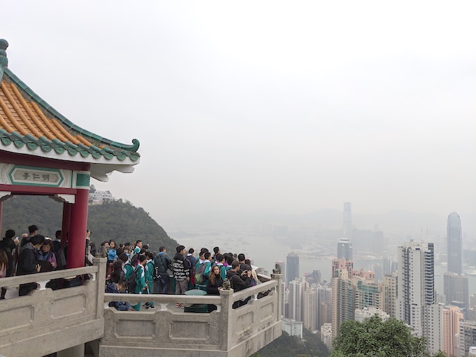 山頂も混んでいるが、撮影には困らないぐらいの広さはあった。展望台からもいいけど、この中国っぽい建物からの眺めのほうが好きだな。