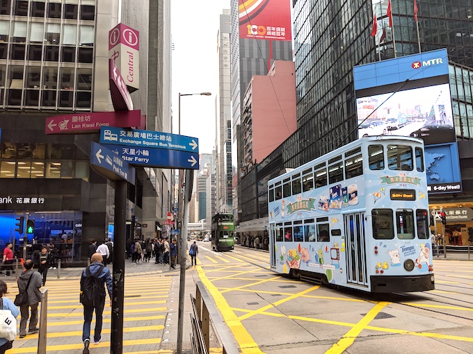 香港島の中環(セントラル)は世界有数の金融街の中心地。こころなしか、行き交う人たちの歩くスピードが速く、焦るように路面電車が行き交っている。