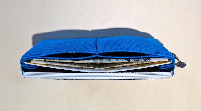 使い方もシンプル。本体がゴムのような素材になっていて、そこにカードと、カードサイズに折りたたんだお札を挟む仕様になっています。コインは横のポケットに詰め込む形です。