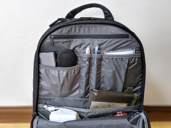 Aer のようなバックパックに特徴的なのがこの収納スペース。たくさんのポケットがあらゆるものを整理してくれます。こちらは一番外側のサブコンパートメント。ジッパーを全開にすると、ぺろんとめくれる構造です。