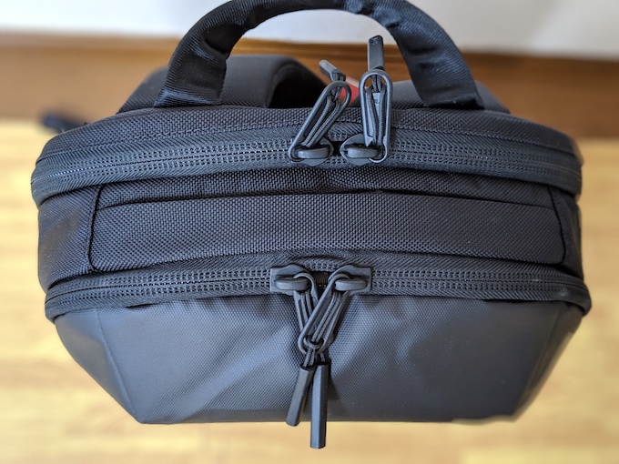 下側のジッパーががサブコンパートメントで、上側がメインのものです。隠しポケットは、Day Pack だとチャックを隠せるので、上記のように本当に隠しポケットになります。