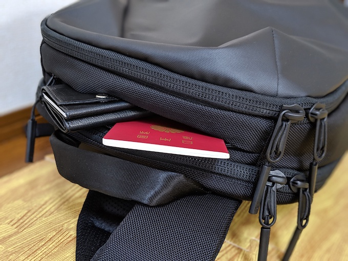 旅行用バックパックも Aer 「Travel Pack」を愛用しています。どちらにもついているのがこの隠しポケットです。メインとサブのコンパートメントの間にあり、貴重品が取り出しやすく、とても便利です。