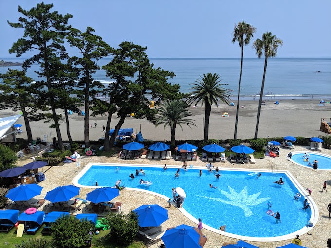 今井浜東急ホテルだと、プールも海も近く申し分ないです。さらに、無料でバスタオルが借りれ、パラソルも予約できます(予約不要のベンチはオープンと同時に埋まってしまう)。