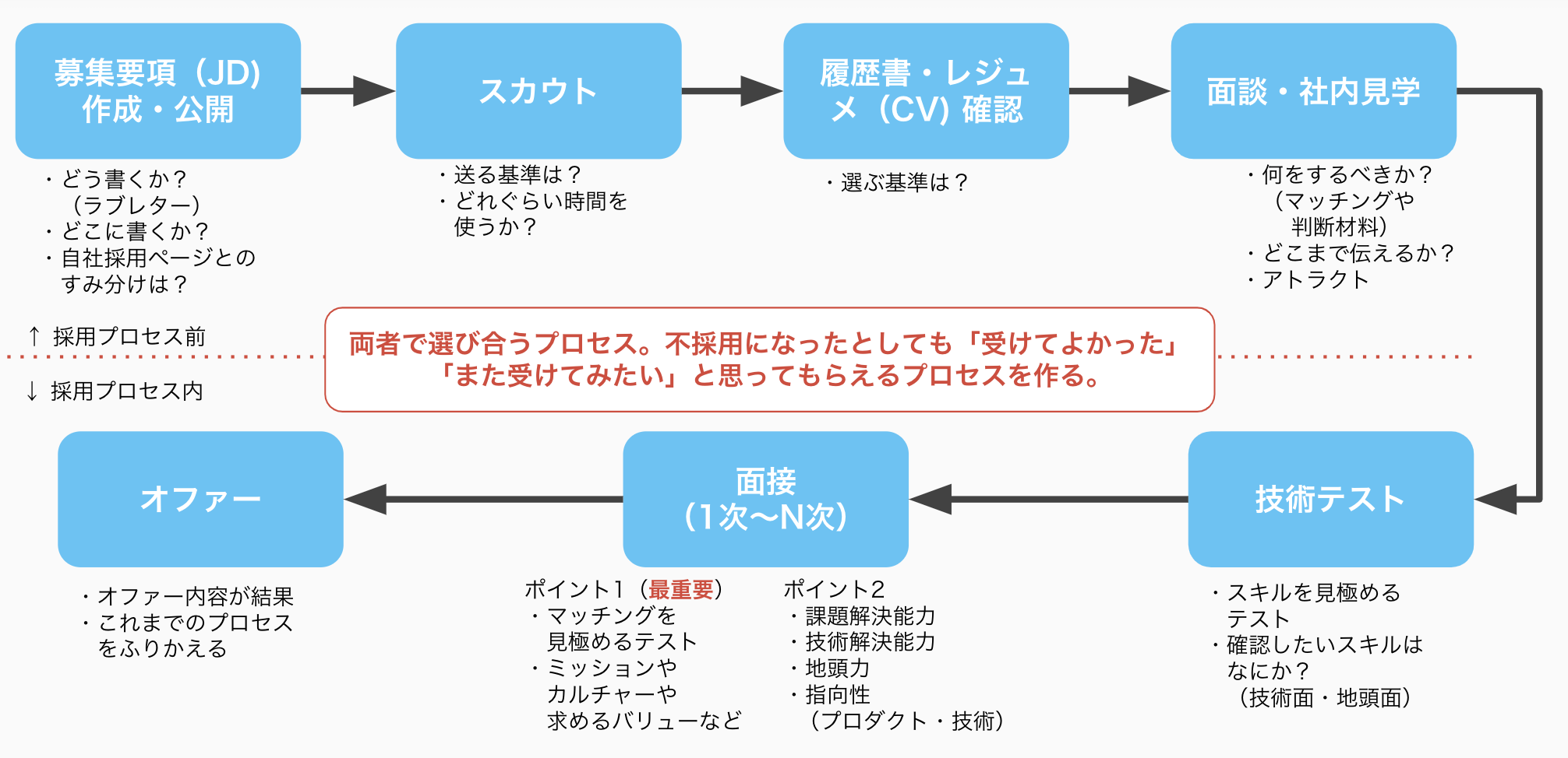 では次から面接プロセスの改善案を、トピックごとにまとめてみます。できたこともあればできなかったこともあります。