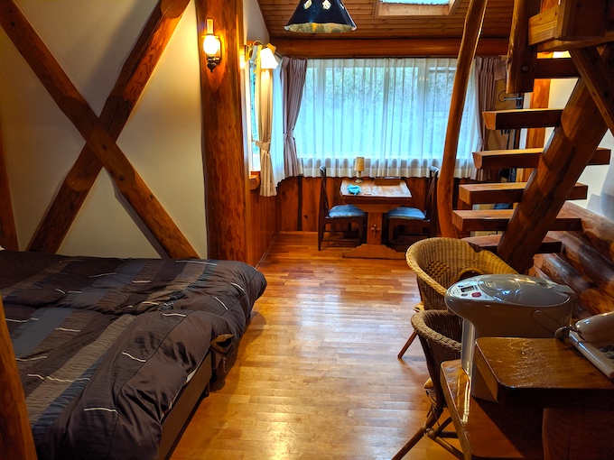 部屋の玄関を開けるとログハウス特有の匂いがします。二階には畳の間があるので、敷布団を引くことも可能(一枚1000円)。ログハウスはひとつひとつが分かれているので、子どもたちが騒いでもあばれても心配なしです。