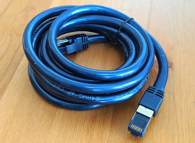 LanケーブルもCAT8(カテゴリ8:超高速40Gbps、超広帯域2000MHz)を選択。みてのとおり本場さぬきうどんぐらいの太さなので、細めのケーブルとは違い曲げる配線が難しいです。