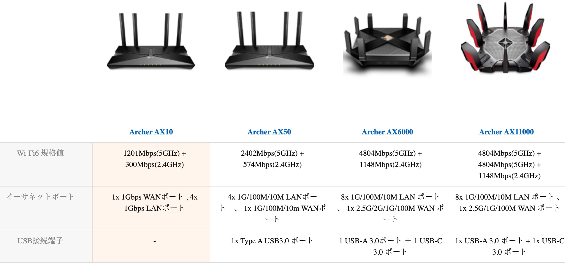 Wi-Fi6対応ルーターは「TP-Link Archer AX50」にしました。この製品は以下のようなシリーズになっています。