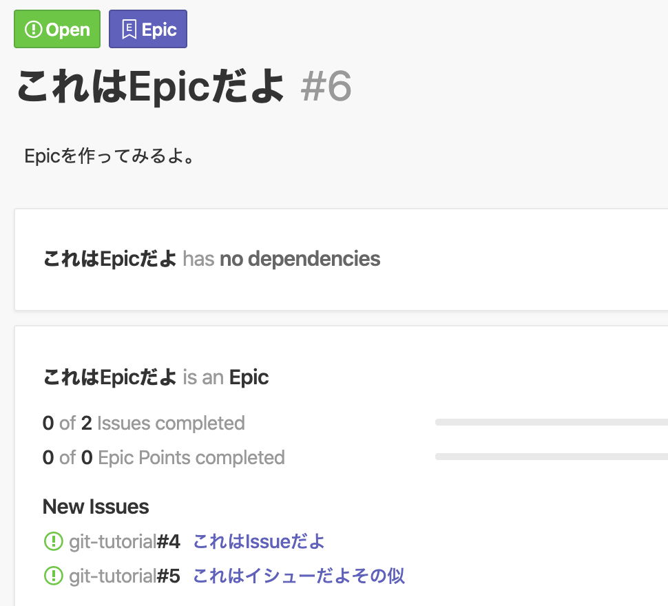 GitHub上で見てみましょう。ZenHubはGitHubと相思相愛なので、対象のリポジトリにIssueが3つできます。Epicは「Epic」というラベルが貼られただけのIssueです。