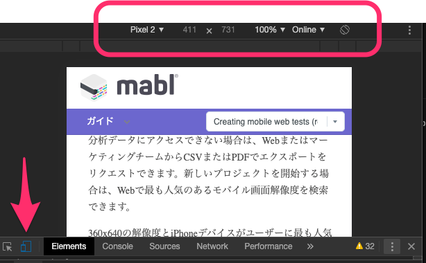 テストを作成するときは、Chromeの開発ツールを開き、デバイスモードを指定すれば、擬似的かモバイル環境のビューになります。