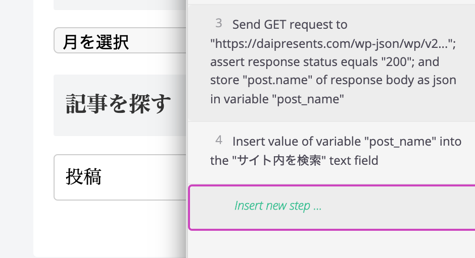 次のSTEPでそのデータを使ったりできます。レスポンスが配列形式の場合は「people[1].address」というような表現で取得もできます。