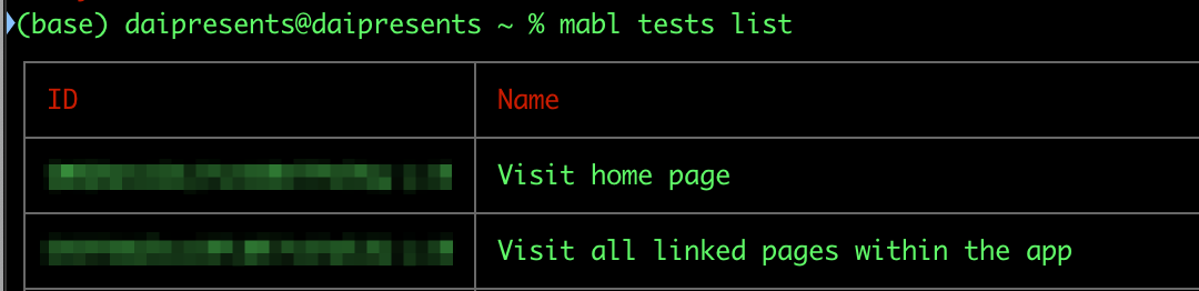 まずテスト一覧を表示します。IDが表示されるのでそのIDをベースに実行してみます。ちなみにデフォルトで作成される「Visit home page」や「Visit all linked pages within the app」はCLIからまだ実行できないようです。