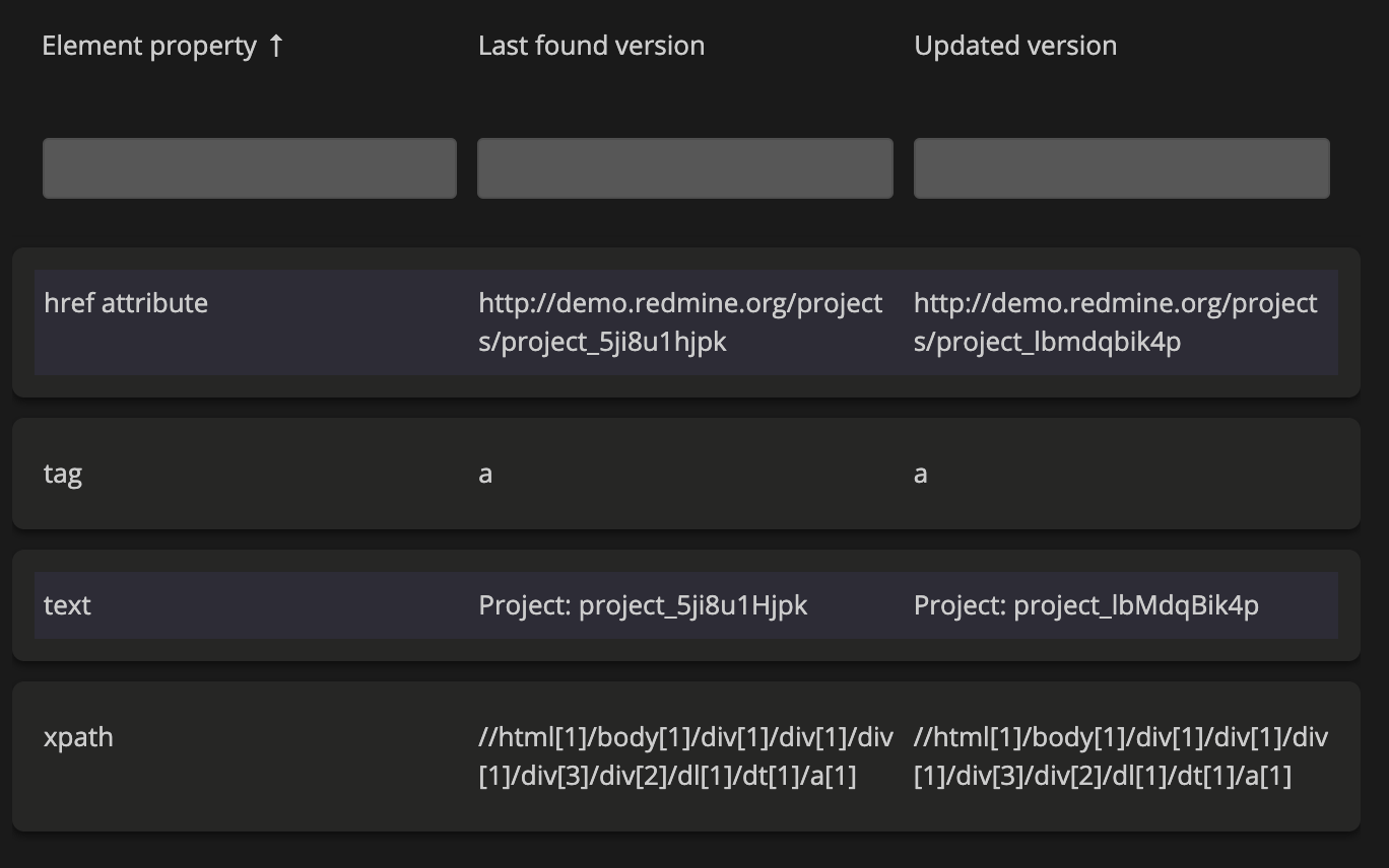 自動修復の仕組みは簡単。特定の要素の情報を「可能な限りたくさん」取得しておき、それらの差分を考慮して自動修復を行います。たとえば、要素を特定する方法はたくさんあります。 タグ名、Xpath、Class、Hrefといった属性値・・・。mablはこれらの情報を記憶し、自動修復に活用しています。