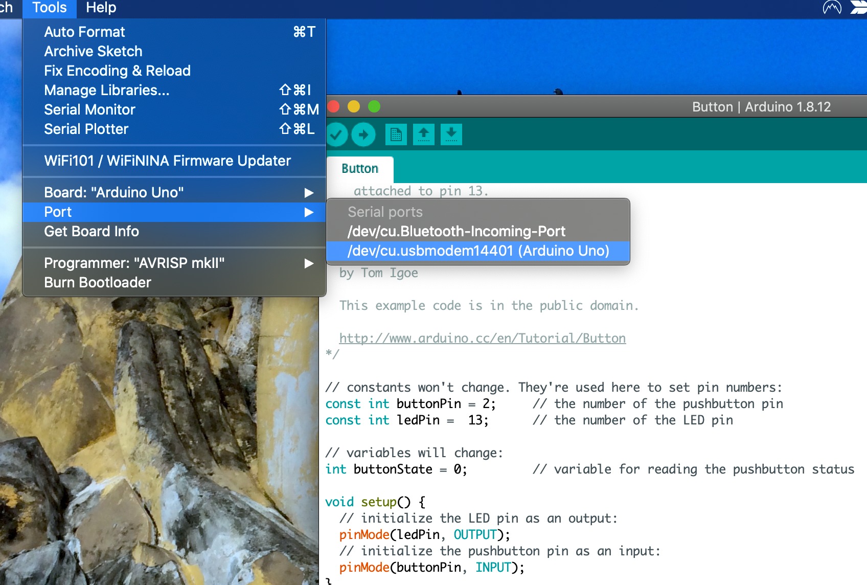 Arduino IDEだと、上記のように「/dev/cu.usbmodem14401」でArduinoとつながっているのがわかる。