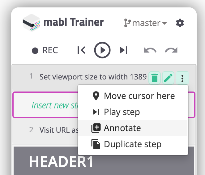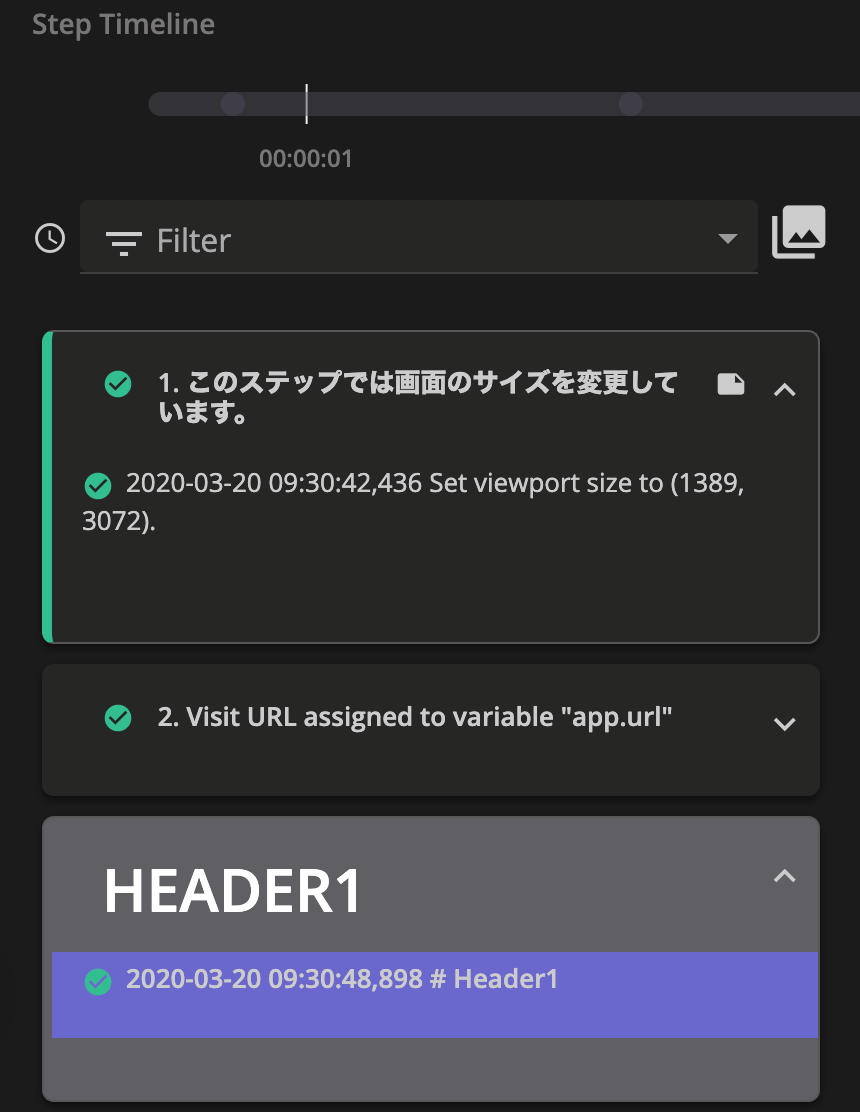 各ステップにはAnnotation(アノテーション)も追加できます。通常、記録していったステップには「Set viewport size to width 1389」のように自動で文字が入りますが、Annotationを使えば好きな文字列を設定できます。