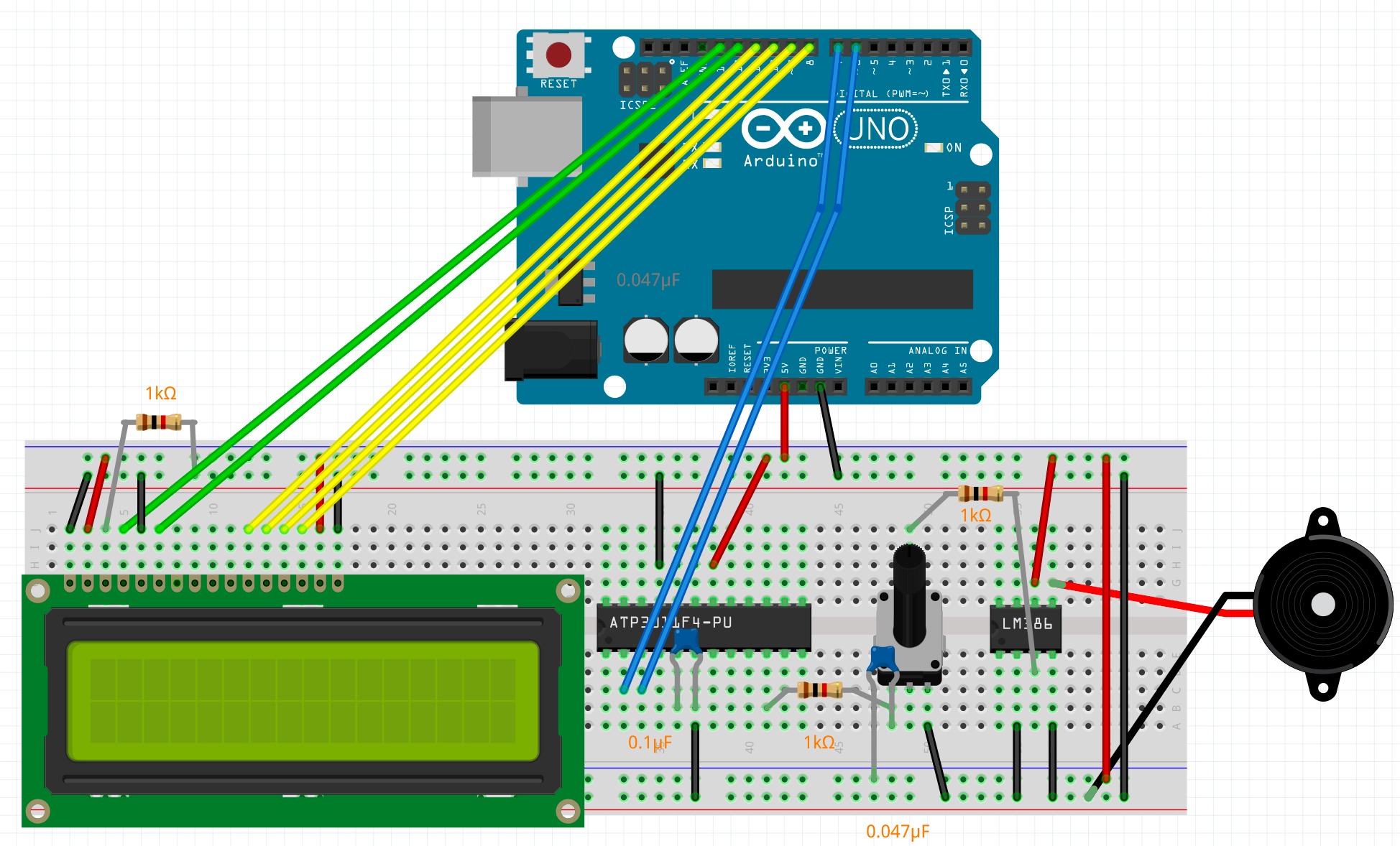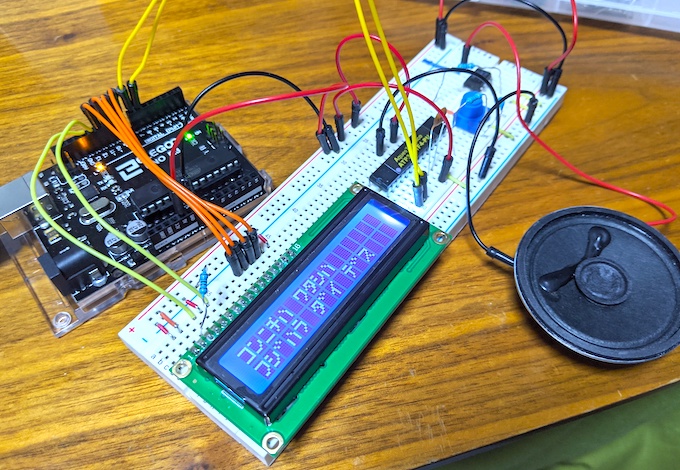 去年からアルバイトでプログラミング教室の先生をはじめたのですが、そこでArduinoを使うので、自己紹介用に回路を作ってみようと思いました。LCDには話している文字を表示させています。
