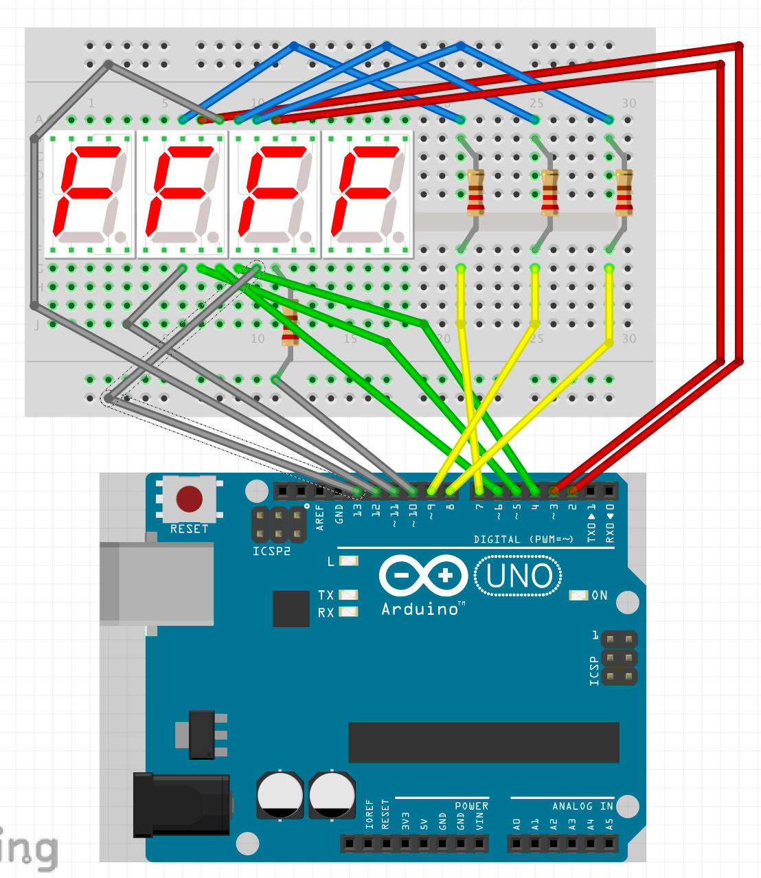 Arduinoで7セグメント4桁表示のLEDディスプレイ(4 Digit 7 Segment LED Display)を光らせるスケッチと回路。サンプルがArduinoのProject Hubにあるけど、これだとうまく動かないので修正しました。