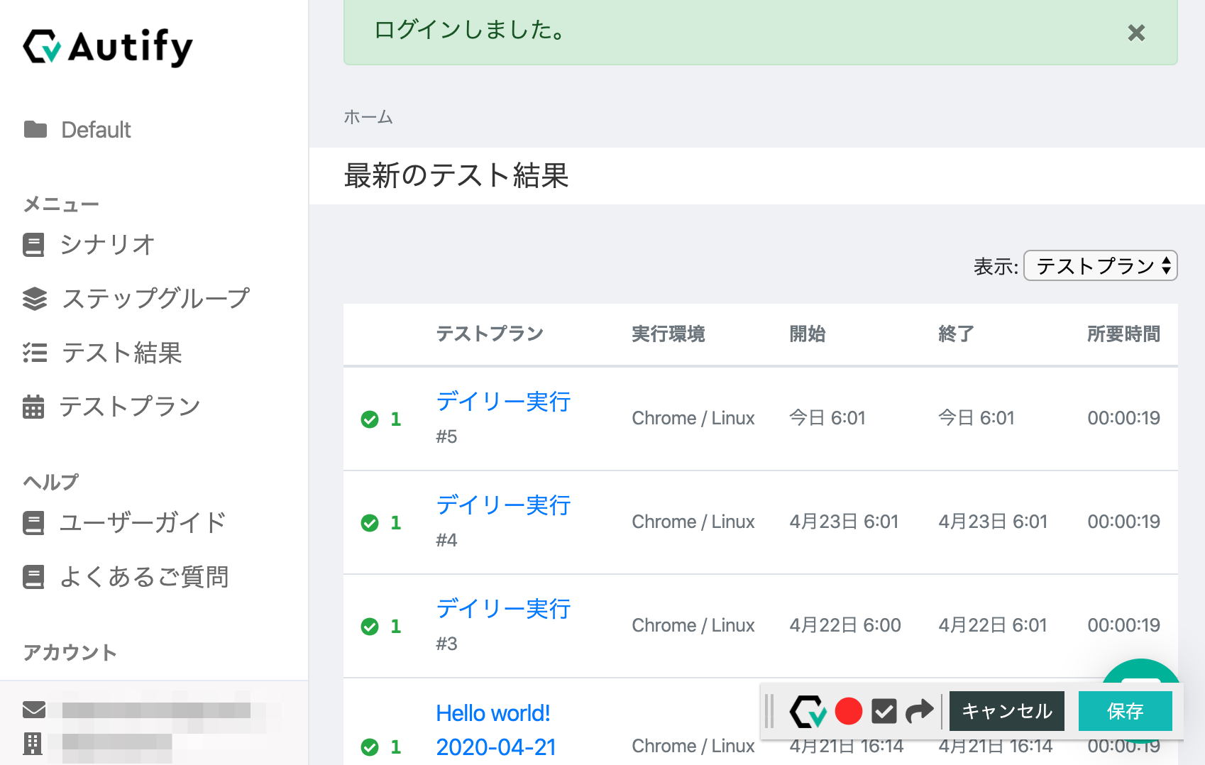 たとえば画面上の「ログインしました。」メッセージを確認しても良さそうです。画面左下のログインユーザのメールアドレスを確認してもいいでしょう。