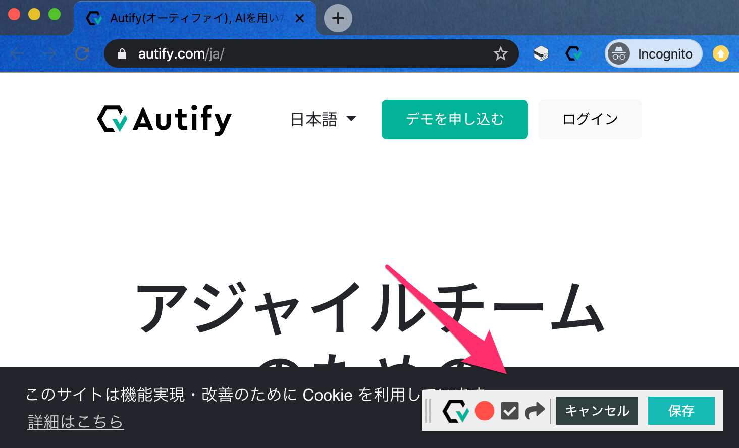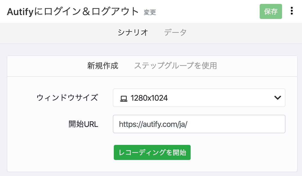 開始URLはテスト対象となるURLです。ここでは「https://autify.com/ja/」にしていますが最初に開いておきたいURLを入力しておき、レコーディングを開始をクリックします。