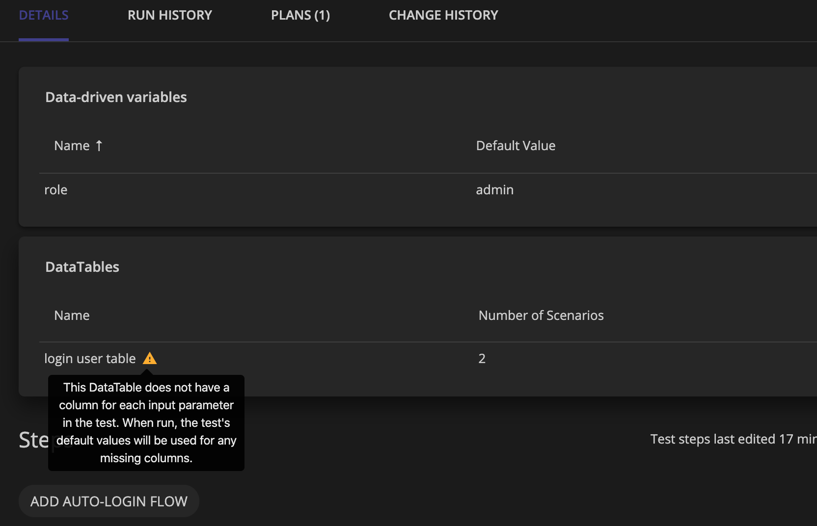 テストの詳細画面を見てみます。Data-driven variablesにデフォルト値の設定が入っていました。またDataTablesに上記のようなメッセージが表示されています。