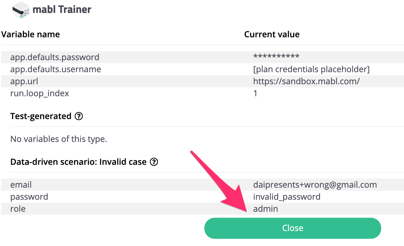 テストにデータテーブルを設定すると自動的にデータが読み込まれます。変数({x}) > Viewを開くと上記のようにemailとpasswordが読み込まれているのがわかるはずです。