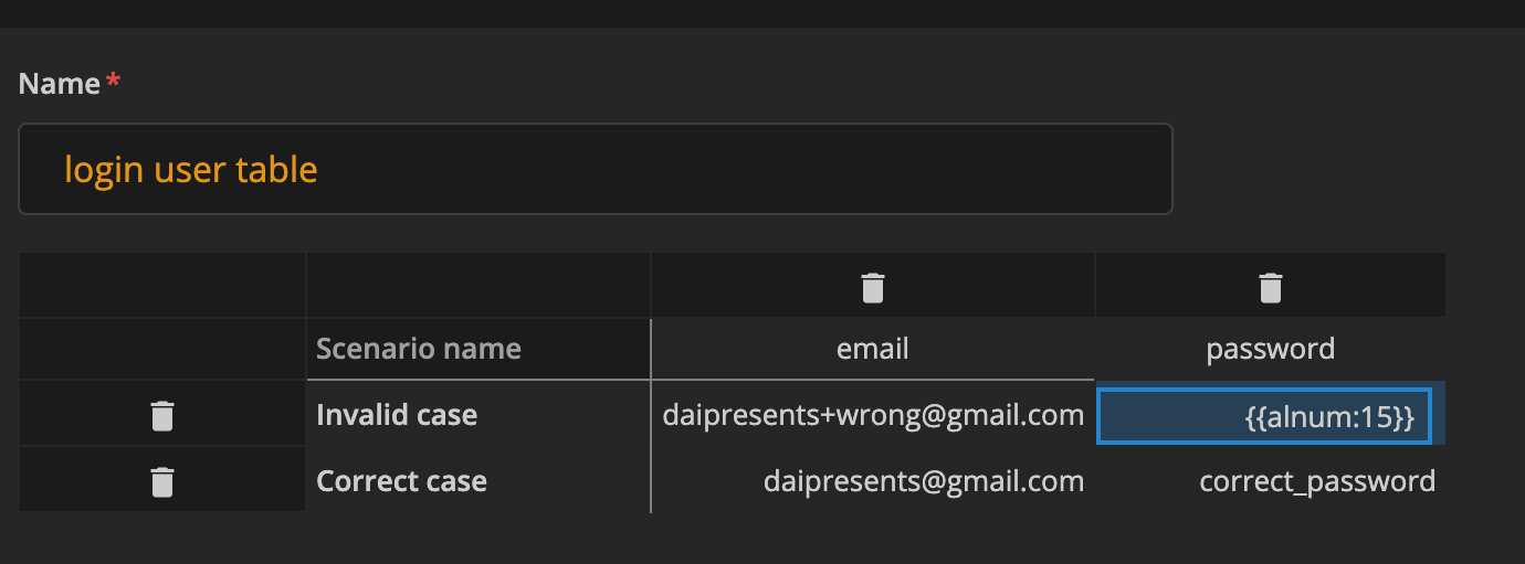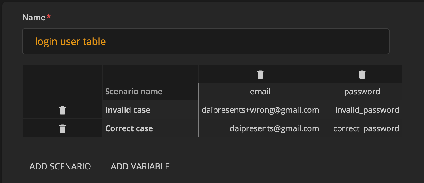 ここでは、ログイン画面で使うEメールアドレス、パスワードをデータとして定義しました。それぞれ「ログイン成功」と「ログイン失敗」というシナリオを想定しています。