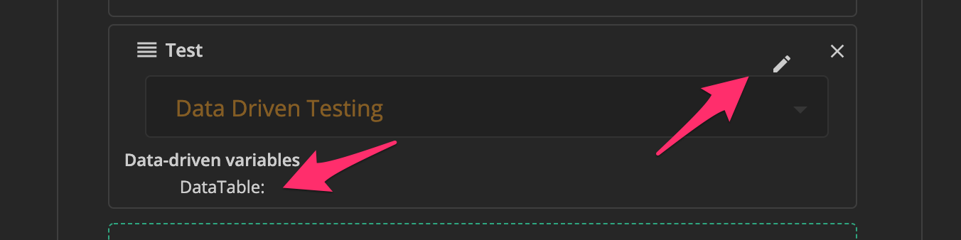 データテーブルを読み込む方法はいくつかあります。まず、テストを作成する際に上記のようにデータテーブルを設定できます。データテーブルは複数設定可能です。