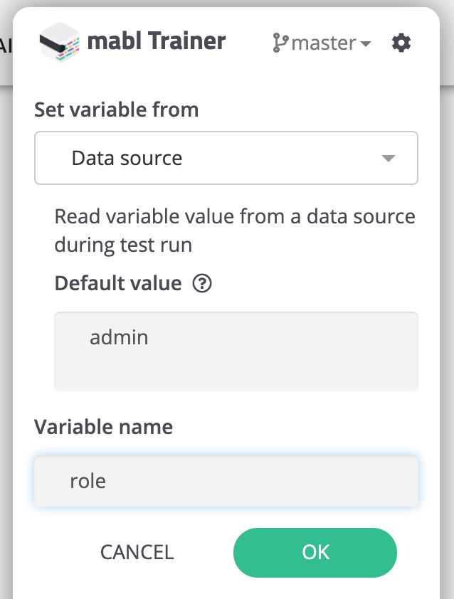 データテーブルの初期値(デフォルト値)は、トレーナーの変数({x}) > Createから設定します。DetaTableではなく「Data source」を選択するのがポイントです。
