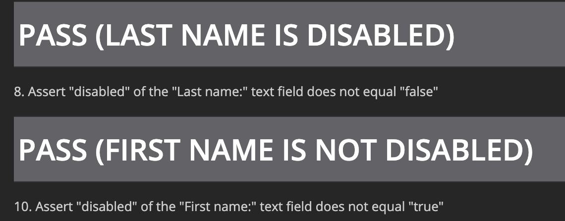 ただ、見ての通り、「Assert “disabled” of the “Last name:” text field does not equal “false”」と、NotなのかFalseなのかDisableなのか、何言ってるのかわかりにくい。