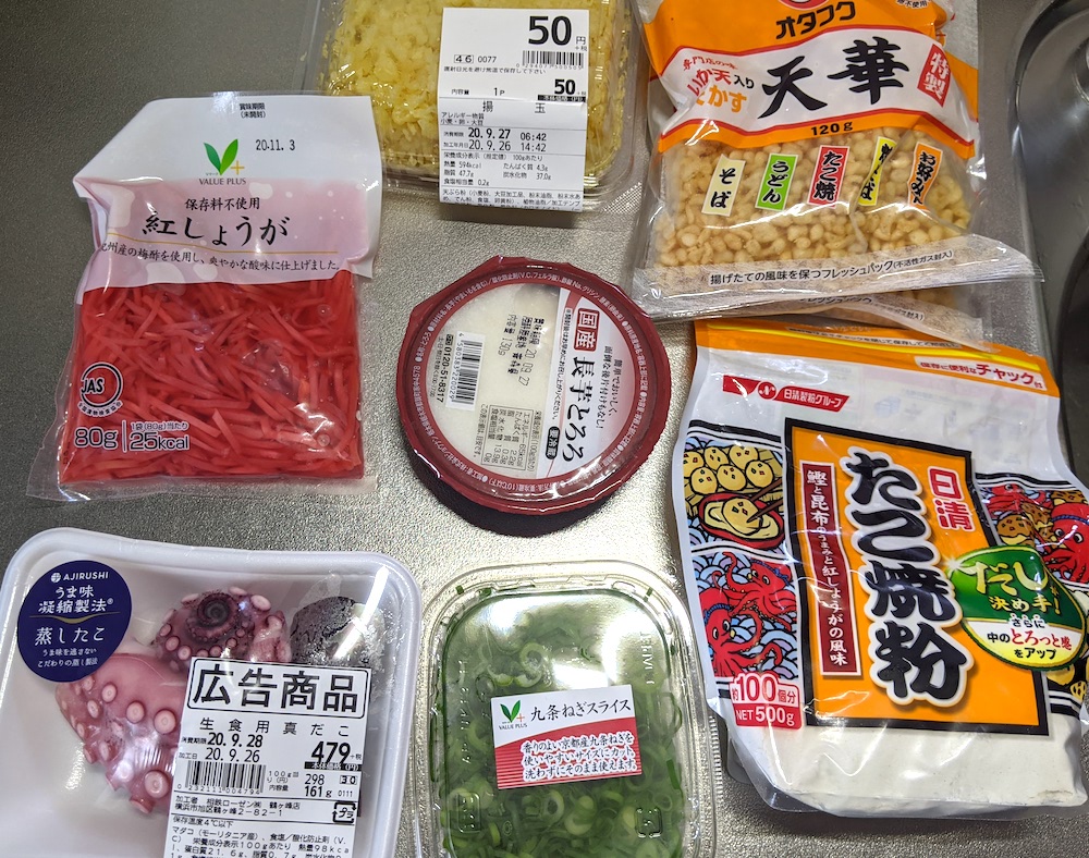 スーパーの天かすと天華を比較していたので、↑には天かすを入れていませんが、ネギ、しょうが、天かすはまとめてまぜておくと、焼く時に楽になります。